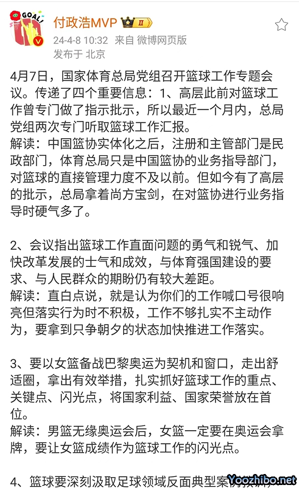 众所皆知,在管办分离之后,总局只是篮协的业务指导部门,对于篮协的直接管理力度不如此前,这也是总局一直对于篮协的举动没有太多动静的原因,而付政浩表示:如今总局有了高层(分管文体的最高层)的批示,总局拿着尚方宝剑,在对篮协进行业务指导硬气多了。