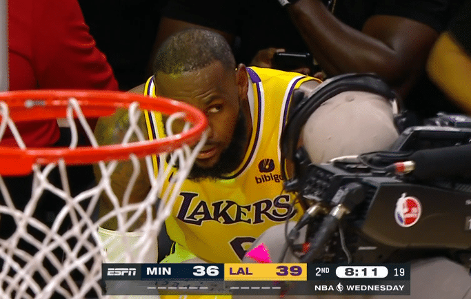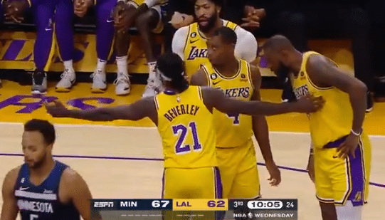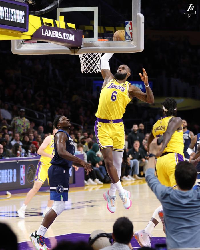 第二节,浓眉换了一条短裤,詹眉单节合砍14分仍一度落后10分,因为湖人外线太糟糕,直到上半场还剩30秒,里夫斯才为湖人命中本场第二记三分,上半场三分球18投仅2中;所幸詹姆斯半场压哨补篮,湖人半场54-62落后8分。