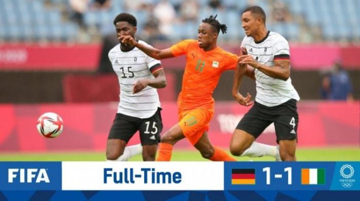 24直播网讯 东京奥运男足小组赛最后一轮,德国国奥1-1战平科特迪瓦国奥。德国国奥3战1胜1平1负,积4分排小组第三被淘汰出局。