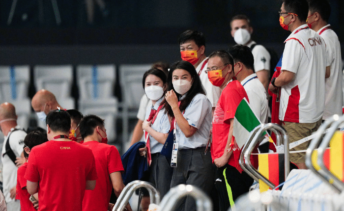这场比赛郭晶晶和陈若琳出现在场边,不同于前几场他们都是穿着T恤,是以中国队支持者。这次两人在跳水的正面,转播镜头可以明显的看到。同时郭晶晶也穿着裁判制服亮相,值得一提的是她们并非是给运动员打分的裁判,而是给裁判打分的比赛监督。