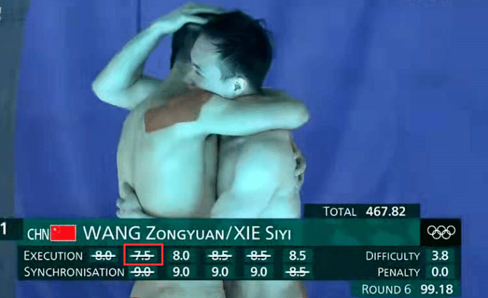 这是显示裁判打分的时候,可以看到9分、8.5分很多,但唯独有一个裁判给的分数是7.5分的超低分,需要说的是如果是水花很小,但有不同步或者起跳高度不够等等还可以理解,但王宗源和谢思埸的最后一跳确实一点问题都没有,不然就不会有那么多的裁判给了9分。而7.5分也只有这一个,确实令人非常意外,也很遗憾。