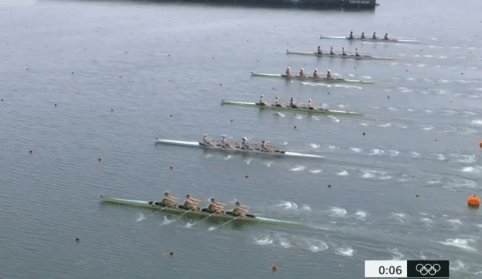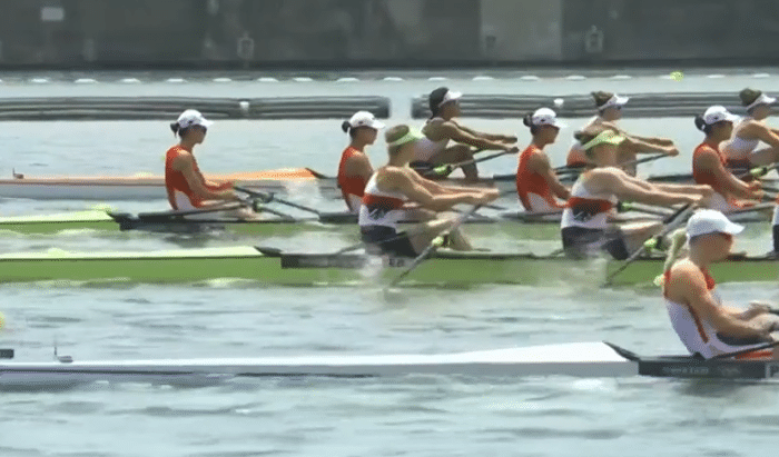 接下来进行的是奥运会赛艇女子四人单桨的决赛,这个项目中国队派出了秦苗苗、鲁诗雨、林心玉、王飞参战,在预赛的比赛里,中国组合秦苗苗/鲁诗雨/林心玉/王飞划出了6分38秒54的成绩,她们以小组第二的身份完成晋级,而荷兰选手则是打破了奥运记录以小组第一的身份晋级。今天的比赛中国队被分在了第五道,二道来自爱尔兰,三道是澳大利亚选手,四道来自荷兰。