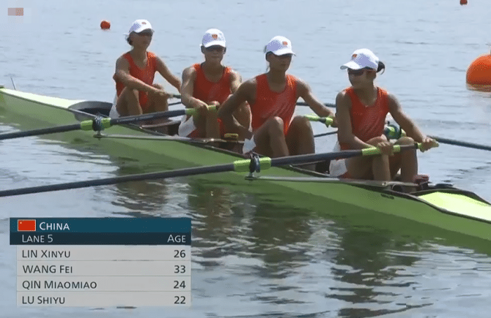 接下来进行的是赛艇女子四人双桨决赛,这个项目中国组合有实力去冲击金牌,因为天气的原因本场比赛被推迟到了今天的举行,代表中国队出战的四位选手陈云霞、张灵、吕扬和崔晓桐,预赛成绩中国以6:14.32小组第一晋级。中国组全在第三道,比赛开始后,中国组合取得了微弱的领先优势,500米的时候,中国队排在了第一的位置。