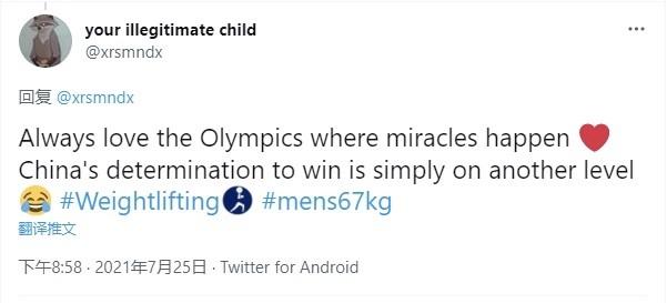 谌利军不仅让对手折服,就连观看直播的外国网友也对他赞不绝口。不少外国网友留言称谌利军这一举将比赛提升到下一个阶段,就像举重界的博尔特。还有外国网友盛赞道:“中国的每一位运动员都太厉害了!”有一位网友暖心写到:“我们爱奥运,正是因为有奇迹。中国人求胜的心与其他国家不在一个层面。”