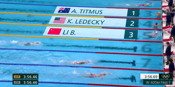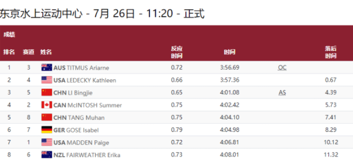 24直播网讯 7月26日,在游泳项目女子400米自由泳决赛连续上演逆转好戏,一直处于领先的美国名将莱德基在最后时刻丢掉金牌,澳大利亚选手蒂特马斯成功翻盘,她以3分56秒69夺得冠军。李冰洁也成功导演大逆转,前300米一直都处于第4名的她依靠着最后75米的发挥,成功逆转,获得第三名,进入到颁奖台。李冰洁的成绩是4分01秒08,打破亚洲纪录。