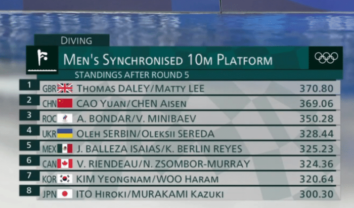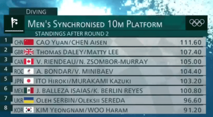 第四跳,韩国队的选手入水堪称是“炸鱼”水花四溅,只有很低的73.44分,位居倒数第一。中国队的陈艾森和曹缘水花没压住,同步还是不错的,73.44分,总分275.82分,被英国队281.04分反超。