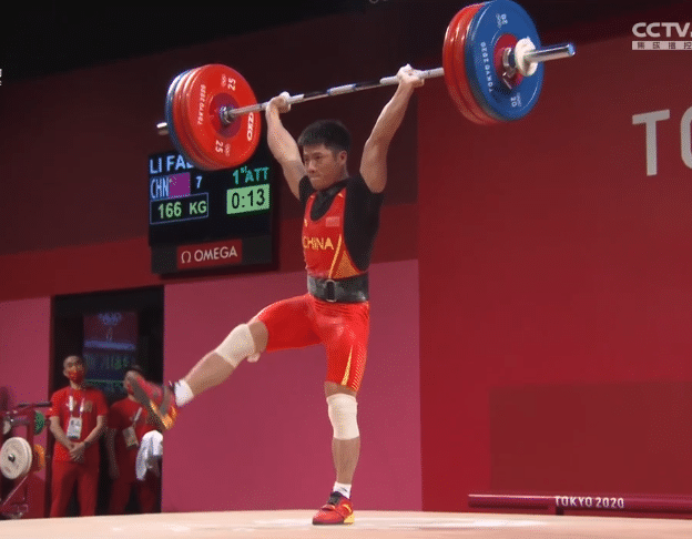 在挺举项目中,伊拉万开把165公斤,李发彬第一把试举166公斤成功举起,单脚举起166公斤太有统治力,第二把举起172公斤,创造新的奥运纪录,第三把试举178公斤失败,总成绩313公斤创造奥运新纪录