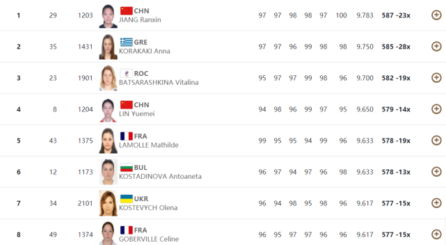 此番,两名中国选手在资格赛中的发挥都相当不错。资格赛一共有6轮,每轮10发子弹。姜冉馨分别打出97环、97环、98环、98环、97环和100环。而林月美分别打出94环、98环、96环、99环、97环和95环。姜冉馨排名资格赛第一,而林月美则排名资格赛第4,双双晋级决赛!