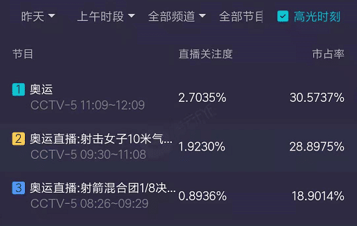 根据数据显示,杨倩夺冠时间是在上午10:26,当时的收视率接近2,而当杨倩夺冠之后,网络上瞬间刷屏,同时在收视率上,升国旗奏国歌登顶当日所有节目的收视冠军,收视率突破2.7,为奥运会首日之最。