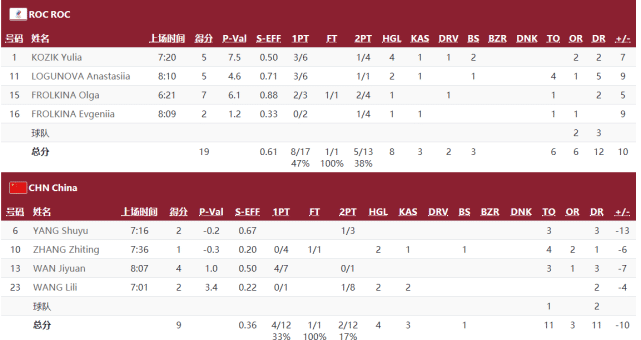 中国队随后换上王丽丽,王丽丽先是篮下得分,随后命中远投。杨舒予此时也命中远投,中国女篮将比分追到了7-12。然而此后,中国队再次陷入得分荒。俄奥队将比分拉开到19-9,比赛时间不够,悬念也彻底丧失。最终,中国女篮不敌俄奥队,吞下一场失利。