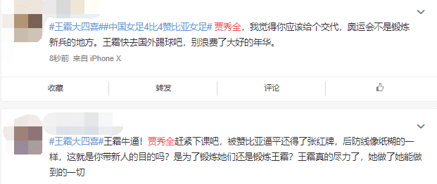 还有球迷表示贾秀全应该给个交代,奥运会不是锻炼新兵的地方。王霜快去国外踢球吧,别浪费了大好的年华;更有球迷表示:求求赶紧下课吧,女足都被你害死了,整场比赛都没见你嘴动过,你散步呢!