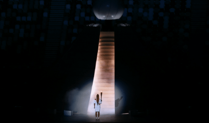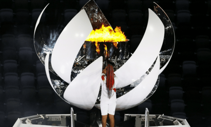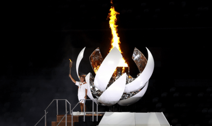 开幕式最后的环节是点燃奥运会圣火,当一众日本体育功勋人员现场传递圣火之后,最后一任火炬手是大阪直美,她拿着火炬走到了中央,缓缓打开了主火炬塔。大阪直美缓步登上台阶,直接点燃了火炬塔,这样第32届夏季奥运会正式开幕。