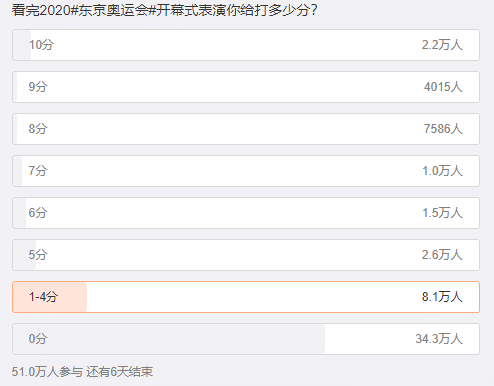 网络上有数十万人参与东京奥运会开幕式投票的,从0-10分都可以选择,通过投票可以看出,有高达51万人参与票选: