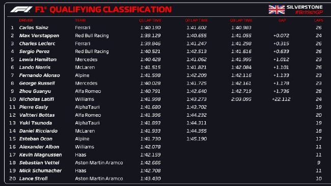 24直播网讯 2022年F1英国大奖赛排位赛在湿滑的银石赛道结束,法拉利车队小塞恩斯雨战中Q3最后一圈完成绝杀!在自己的第150场大奖赛拿到生涯首个杆位!红牛车队维斯塔潘第二,塞恩斯的队友勒克莱尔第三。