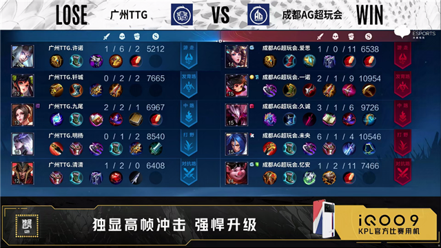 第一局双方常规开局。3分27秒广州TTG发育路击杀盾山拿下一血。3分36秒成都AG拿下暴君。4分38秒广州TTG摧毁敌方发育路外塔,团战成都AG击杀太乙真人。5分40秒双方互换边路外塔。5分43秒广州TTG拿下先知主宰。6分10秒野区团成都AG打出0换2。8分05秒成都AG拿下暴君,暴君处团战广州TTG击杀盾山。9分50秒成都AG摧毁敌方对抗路外塔。10分25秒广州TTG中路击杀盾山。10分45秒主宰处团成都AG打出0换2。11分36秒成都AG拿下暗影暴君,随后摧毁敌方中路外塔。12分56秒成都AG野区击杀太乙真人。13分31秒成都AG拿下暗影主宰。14分07秒成都AG摧毁敌方发育路二塔。15分08秒成都AG摧毁敌方中路二塔。15分25秒成都AG拿下暗影暴君。16分47秒广州TTG对抗路击杀盾山。18分19秒广州TTG摧毁敌方对抗路二塔。20分24秒对抗路团成都AG打出1换3。21分钟成都AG摧毁敌方对抗路高地塔。22分42秒成都AG拿下风暴龙王。23分39秒高地团成都AG打出0换4。23分55秒成都AG摧毁敌方水晶拿下比赛。