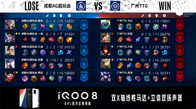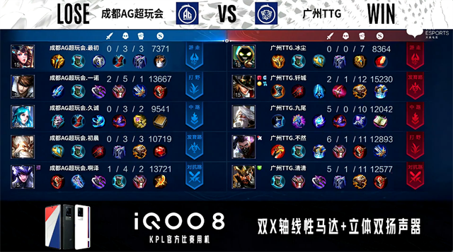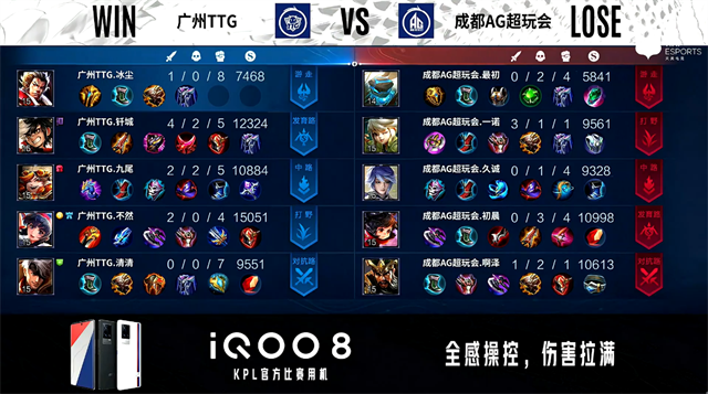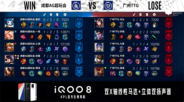 双方常规开局。2分17秒广州TTG拿下暴君。4分06秒广州TTG拿下主宰。4分40秒广州TTG发育路击杀李元芳拿到一血。6分59秒广州TTG摧毁敌方发育路二塔。7分39秒中路团战广州TTG打出0换2并摧毁中路外、二塔。8分22秒广州TTG拿下主宰。9分33秒广州TTG摧毁敌方对抗路二塔。10分15秒拿下暗影暴君。10分59秒广州TTG拿下暗影主宰。11分14秒中路团战成都AG打出0换2。11分45秒成都AG摧毁敌方中路外塔。13分03秒发育路团战成都AG击杀蒙犽。14分36秒暴君处团战广州TTG击杀关羽并拿下暗影暴君。15分33秒广州TTG拿下暗影主宰。16分53秒对抗路团战广州TTG打出1换3。17分41秒广州TTG摧毁敌方水晶拿下比赛。