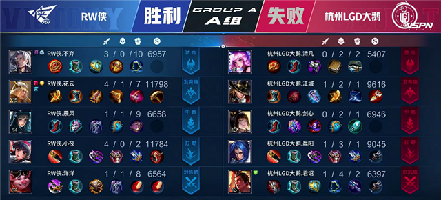 1分50秒杭州LGD大鹅强攻上路一塔,盘古拿下一血。2分10秒盘古拿下主宰。3分15秒中路交火,盘古被击杀。3分51秒澜拿下暴君。4分40秒成吉思汗推掉下路一塔。5分10秒野区团战,双方1换1。6分45秒RW侠强攻中路一塔,廉颇被击杀。7分钟成吉思汗推掉下路二塔,RW侠推掉中路二塔。8分20秒澜拿下暴君。8分40秒马可波罗推掉下路一塔。10分40秒澜拿下暴君。12分40秒中路团战,廉颇被击杀。13分40秒澜拿下主宰。15分20秒高地团战,RW侠团灭杭州LGD大鹅。15分40秒RW侠推掉水晶拿下本场比赛胜利。