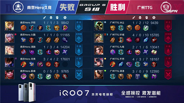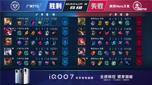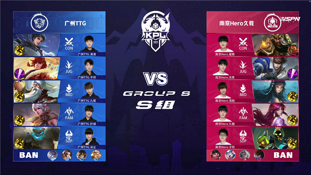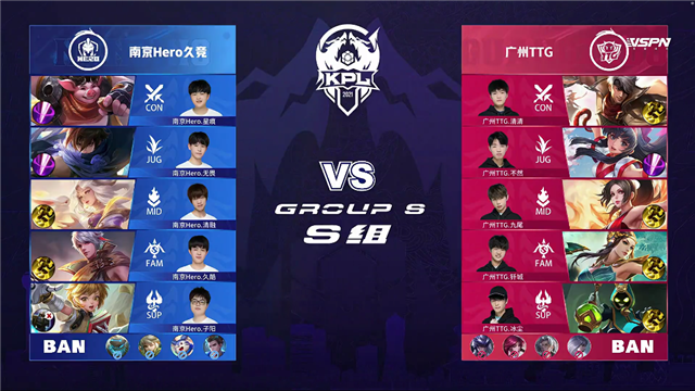 广州TTG三Buff开局,2分45秒广州TTG拿下先知主宰。4分12秒团战双方1换1,广州TTG拿下暴君。5分20秒团战双方1换1,5分38秒广州TTG击杀太乙真人。6分30秒团战双方1换1,8分钟广州TTG拆掉南京Hero上路二塔,8分39秒广州TTG拿下暴君。10分20秒广州TTG拿下暗影主宰,10分30秒中路团双方1换1,12分03团战双方2换2。12分47秒团战广州TTG打出0换3,拆掉南京Hero下路高地。13分钟广州TTG拆掉南京Hero中路高地,打出0换2一波团灭南京Hero,一波拆掉水晶拿下胜利。