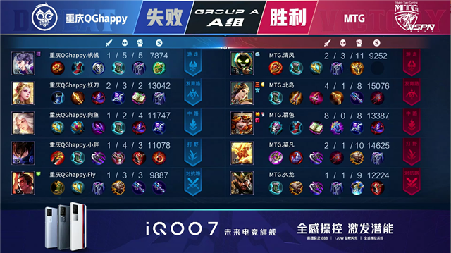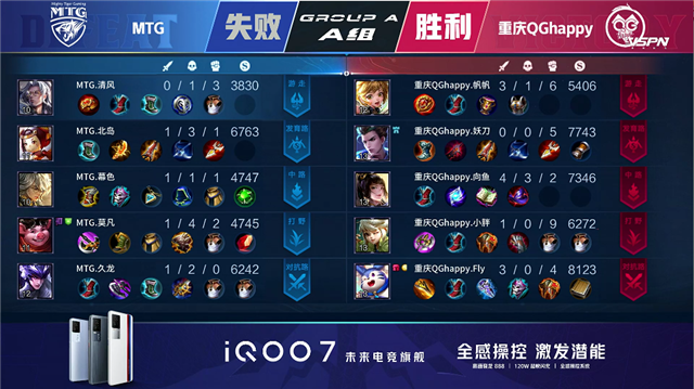 开局MTG反掉重庆QG蓝buff。1分30秒,重庆QG梦奇抢到MTG蓝buff。2分58秒,重庆QG孙膑击杀猪八戒拿下一血。3分27秒,MTG中路击杀上官婉儿。4分27秒,MTG河道击杀孙膑。4分43秒,MTG马超击杀上官婉儿。5分29秒,MTG破掉重庆QG下一塔。5分57秒,重庆QG野区击杀鲁班大师。6分36秒,重庆QG越塔开团,双方1换1。8分钟,重庆QG拿下暴君并击杀猪八戒。8分59秒,中路团,重庆QG打出0换3并连续破掉MTG中路两座外塔。10分42秒,重庆QG团战打出0换2,随后破掉MTG中高地。11分05秒,重庆QG摧毁MTG水晶拿到赛点。