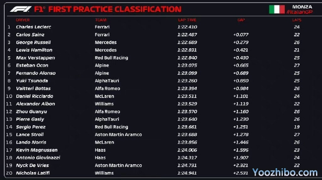 2022年F1意大利大奖赛第1次练习赛成绩表