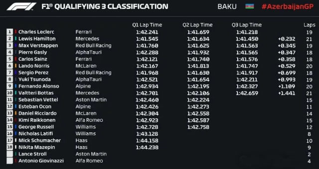 2021F1阿塞拜疆站三练成绩: