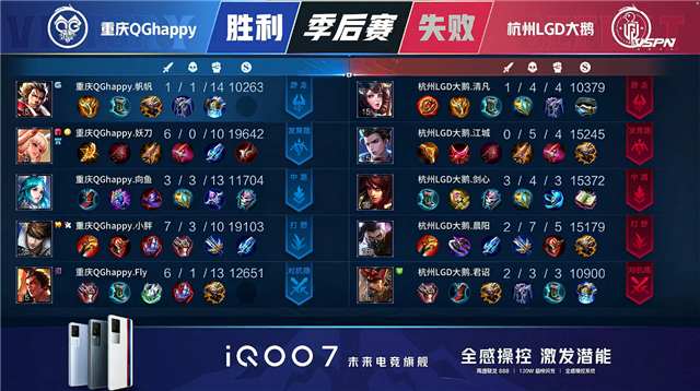 双方常规开局。1分13秒重庆QG拿下中路河道之灵。1分37秒杭州LGD大鹅野区击杀张飞拿到一血。1分47秒杭州LGD大鹅关羽上路单杀露娜。2分30秒杭州LGD大鹅上路击杀露娜。3分04秒重庆QG下路击杀后羿。3分28秒重庆QG拿下暴君。4分38秒重庆QG野区击杀西施。5分28秒杭州LGD大鹅野区击杀廉颇。5分40秒重庆QG中路击杀张飞。6分01秒杭州LGD大鹅上路击杀露娜。7分15秒杭州LGD大鹅中路击杀墨子。7分32秒杭州LGD大鹅拿下主宰。7分51秒重庆QG拿下暴君。8分16秒野区团战重庆QG打出0换2。9分23秒重庆QG摧毁敌方中路外塔。10分19秒重庆QG拿下暗影暴君。10分32秒重庆QG露娜野区单杀关羽。11分01秒下路团战重庆QG打出0换2。12分14秒双方野区1换1。13分13秒重庆QG露娜上路单杀关羽。13分38秒重庆QG摧毁敌方下路高地塔。14分04秒高地团战双方2换2,重庆QG摧毁敌方中、上高地塔。15分18秒中路团战重庆QG打出1换2。15分38秒重庆QG野区击杀张飞。15分55秒重庆QG摧毁敌方水晶拿下比赛。
