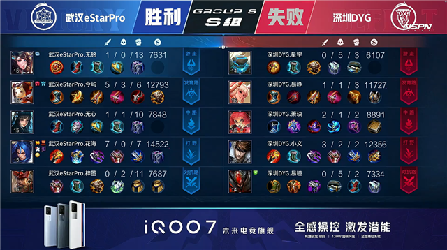 开局深圳DYG周瑜换线到对抗路。2分05秒深圳DYG下路击杀公孙离拿到一血。2分22秒武汉ES上路击杀周瑜。2分30秒深圳DYG拿下暴君。3分58秒下路团战深圳DYG打出1换2,裴擒虎拿到二连击破。5分30秒武汉ES下路打出0换2。深圳DYG裴擒虎中路单杀娜可露露。6分12秒野区团战武汉ES打出0换2,深圳DYG摧毁敌方中路外塔。6分55秒武汉ES拿下暴君。7分18秒武汉ES下路击杀梦奇。7分31秒武汉ES下路击杀裴擒虎。8分09秒武汉ES拿下主宰。9分54秒武汉ES中路击杀大乔。10分22秒武汉ES拿下暗影暴君。10分35秒武汉ES主宰处击杀梦奇。11分04秒武汉ES摧毁敌方上路二塔。11分28秒武汉ES拿下暗影主宰。12分08秒武汉ES野区击杀裴擒虎。12分17秒武汉ES摧毁敌方中路外塔。12分51秒武汉ES中路击杀周瑜。13分15秒武汉ES摧毁敌方下路高地塔。15分11秒上路团战双方1换1。16分10秒武汉ES拿下暗影主宰。18分52秒武汉ES上路击杀大乔。20分37秒中路团战武汉ES打出0换2。21分06秒武汉ES摧毁敌方水晶拿下比赛。