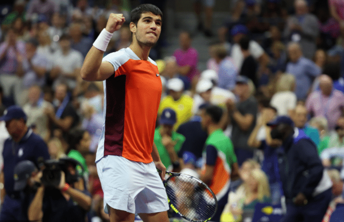 这场比赛,阿尔卡拉斯和鲁德在前两盘平分秋色。第三盘成为比赛的转折点。鲁德浪费两个盘点机会,阿尔卡拉斯逃出生天,最终通过抢七拿下第三盘。第四盘,阿尔卡拉斯完成关键破发后,6-3再胜一盘,最终3-1击败鲁德,夺得冠军。阿尔卡拉斯本届美网连打3场五盘大战,可以说冠军含金量十足。