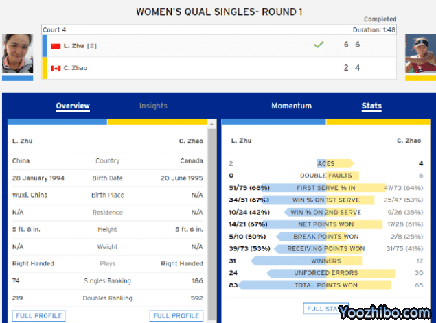 zhu琳的对手是世界排名第186位的加拿大华裔选手赵一羽。作为2号种子,这场比赛zhu琳显然更被看好。首盘比赛,zhu琳在第3局率先破发,随后躲过破发点取得3-1领先。zhu琳保持优势,盘末再度破发,6-2拿下首盘。第二盘,两人展开鏖战。zhu琳在3-4被对手破发的情况下连胜3局,最终6-4再胜一盘,2-0取胜晋级。