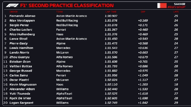 2023赛季F1巴林大奖赛第2次练习赛成绩表:
