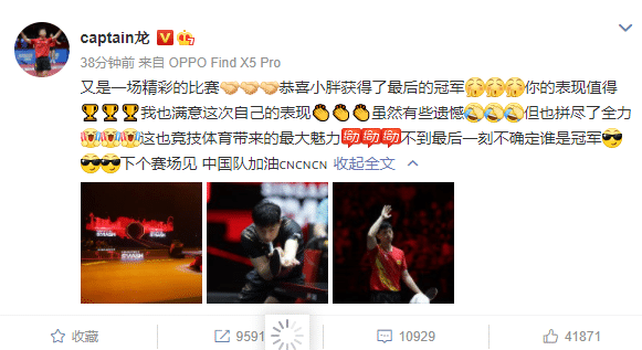 到了3月21日,马龙休整之后在社交媒体上发文,他表示:“又是一场精彩的比赛,恭喜小胖获得了最后的冠军,你的表现值得冠军,我也满意这次自己的表现,虽然有些遗憾,但也拼尽了全力,这也竞技体育带来的最大魅力,不到最后一刻不确定谁是冠军,下个赛场见 中国队加油”