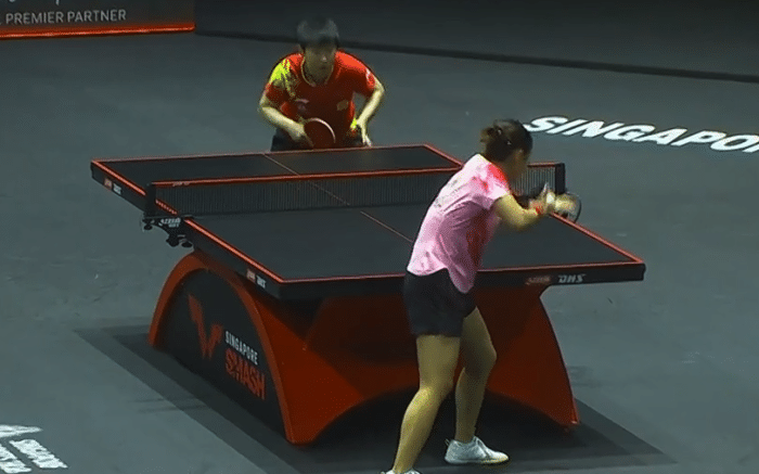 第一局的比赛开始,孙颖莎8:3的领先,中局过后,刘诗雯被孙颖莎限制住了,孙颖莎主动上手失误,刘诗雯勾手发球,连续爆冲得分,多拍相持,反手对攻,孙颖莎得分,刘诗雯回球下网,11:5,孙颖莎拿下第一局,大比分1:0领先,由于是国乒内战,两人场边是没有教练的,所以只能靠自己去调整。
