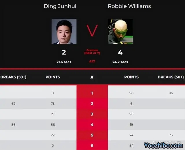 第一局,罗比-威廉姆斯精彩的传球上手,直接单杆93分拿下。第二局,双方开局拉锯过后,丁俊晖抓住机会,打出了单杆62分,以75-1拿下第二局。第三局,罗比-威廉姆斯几次上手,以67-3超11分,丁俊晖没有放弃,追回16分,利用最后一颗红球做球;缠斗过后,罗比-威廉姆斯抓住机会上手拿下第三局。第四局,罗比-威廉姆斯拿下19分防守,防守比拼过后,罗比-威廉姆斯长台不进留下机会,丁俊晖单杆86分拿下。双方2-2战平。