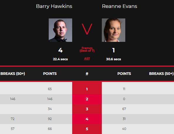 斯诺克英格兰公开赛继续进行,霍金斯4-1轻取女子世界冠军埃文斯,轰出单杆146分、72分、57分大获全胜,第二局他差点完成满分杆,打过一次球,正赛对阵杰克.琼斯,获得职业资格以来,埃文斯没赢过比赛。