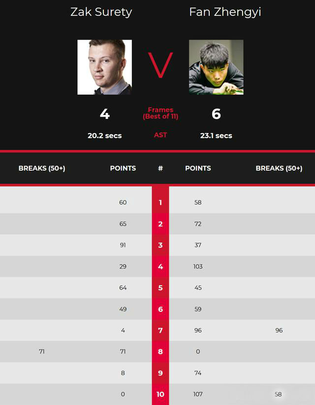 第5局,舒尔蒂以64-45赢下,3-2第三次领先。第6局,范争一以59-49拿下这一局,3-3双方再次回到同一起跑线。第7局,范争一打出这场比赛两人之间的第一杆50+(96分),96-4胜出,4-3反超比分,这也是他在本场比赛第一次领先对手。