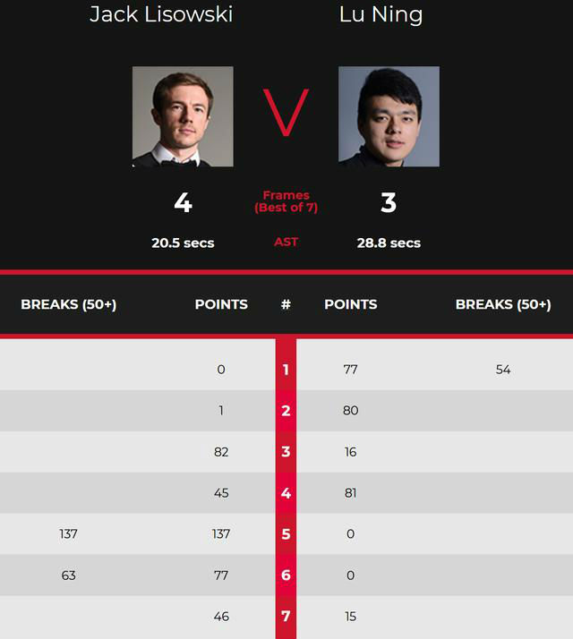 第一局,鲁宁打出单杆54分后中断,利索夫斯基防守和进攻均出现失误,鲁宁再次上手完成超分,77-0零封,顺利取得开门红。第二局,鲁宁又率先入局,73-0完成超分,利索夫斯基上来热身,总算拿分,但本局悬念已经失去,鲁宁80-1再下一城,2-0领先,利索夫斯基两局仅仅拿到1分。