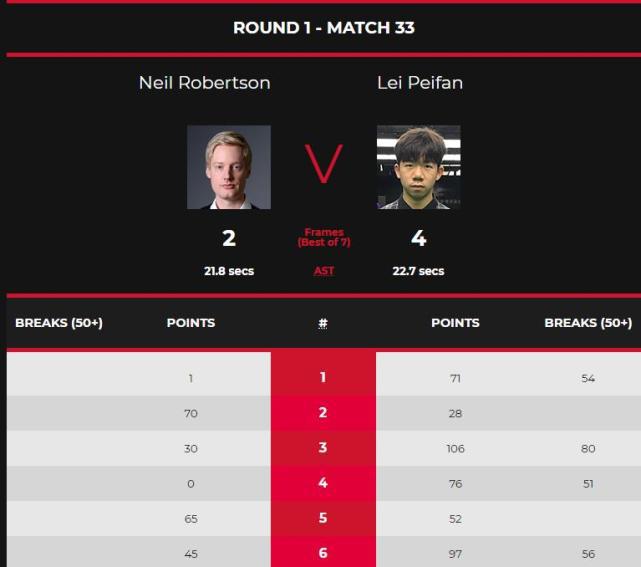 比赛开始雷佩凡打出单杆54分71-1先拔头筹,第二局罗伯逊多次上手70-28扳平比分,第三局,雷佩凡又打出单杆80分,106-30拿下,2-1领先。第四局打出单杆51分两次上手76-0拿下,3-1率先拿到赛点。