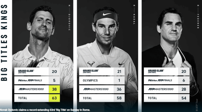 这位世界排名第一的球员以6-0、7-6(5)击败了西西帕斯,不仅获得了个人第六个罗马大师赛冠军,还在“重大赛事”冠军榜中扩大了自己的领先优势。塞尔维亚人现在有63个,领先纳达尔(58个)5个,领先罗费德勒(54个)9个。“重大赛事”是指大满贯、ATP总决赛、ATP大师或奥运会单打金牌。