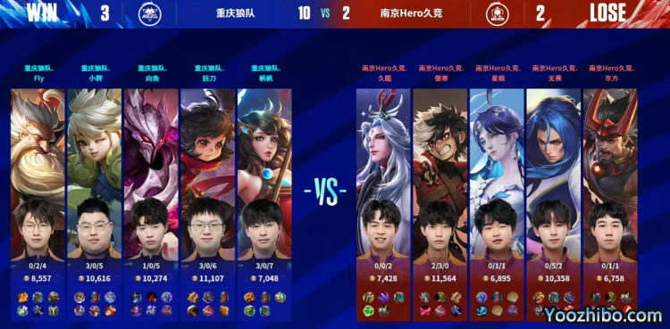 第三局hero选了并不常见的花木兰边路,东方的花木兰熟练度不够高,开局就送出了一血。这局小胖的露娜非常丝滑,并且妖刀的伽罗在队友的保护下输出环境非常好,赵怀真的切后排能力比较一般,而花木兰显然没有切后排的意识,狼队率先拿到赛点。