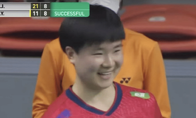 因为安洗莹挑战成功,所以这一分算给了韩国队选手,何冰娇没有做过多的辩解,只是笑笑不说话,然后打出一波流的进攻,这一局以21-13轻松拿下,总分2-0直接横扫安洗莹,挺进女单决赛。