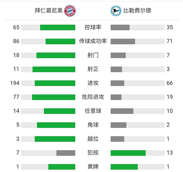 查看:拜仁慕尼黑vs比勒菲尔德 全场录像技术统计: