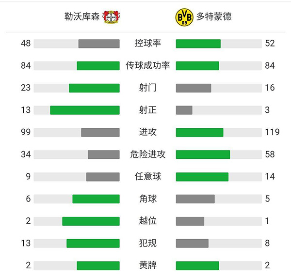 查看:勒沃库森vs多特蒙德 全场录像技术统计: