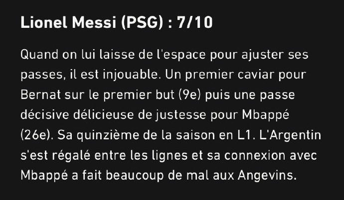 《队报》给梅西本场比赛打了7分高分,仅次于姆巴佩,《队报》还盛赞梅西道:“当你给梅西空间时,他是不可阻挡的,贝尔纳特的第一个进球,然后及时助攻姆巴佩,这是他在联赛中的第15次助攻,莱奥与姆巴佩配合得非常默契,对昂热造成了很大的伤害。”