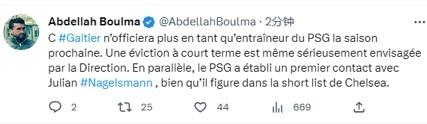 24直播网04月06日讯 ,来自法国知名记者Abdellah Boulma的透露,巴黎圣日耳曼俱乐部正在考虑现在就解雇主帅加尔蒂,而不是等到今年夏天赛季结束后再换帅。而在解雇加尔蒂后,大巴黎考虑邀请赋闲在家的德国少帅纳格尔斯曼接任。