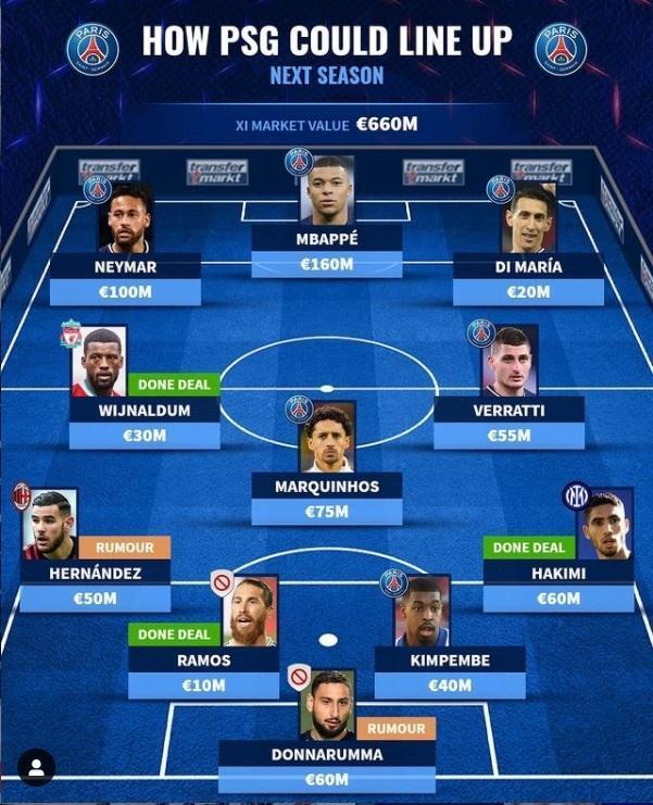 24直播网讯 北京时间7月10日,德转预测了下赛季巴黎圣日耳曼的首发阵容,总身价高达6.6亿欧元,其中姆巴佩1.6亿领衔首发名单。