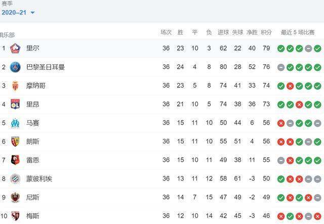 目前里尔36轮积79分排名第一,巴黎36轮76分第二,摩纳哥36轮74分第三,里昂36轮73分第四。