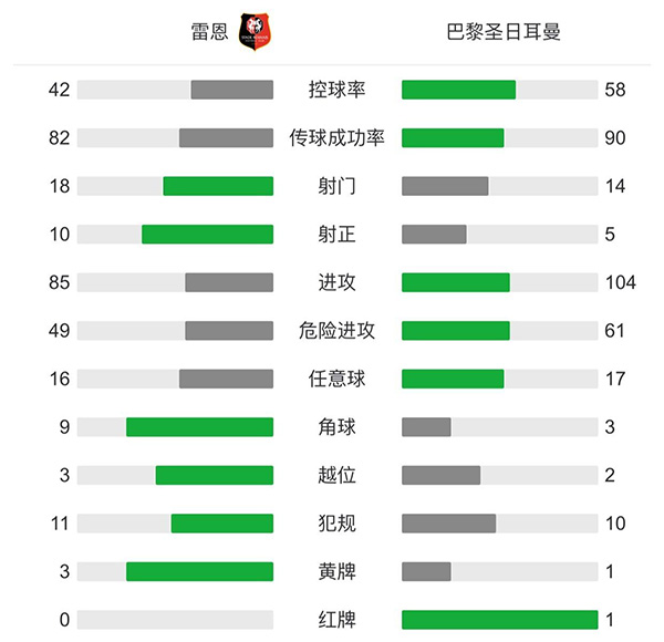 巴黎1-1雷恩  内马尔点射金彭贝染红
