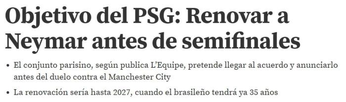 《队报》表示,巴黎方面希望在欧冠半决赛开始前搞定内马尔的续约,并将其公之于众,他们将这个时间点设为最后期限,巴黎主席纳赛尔正在为此努力。
