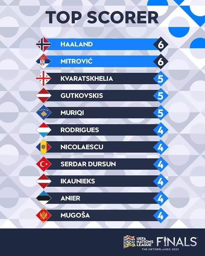 现在本赛季欧国联赛事已经只剩下了C级联赛的降级附加赛,直布罗陀和塞浦路斯以及立陶宛和白俄罗斯将会为保级展开争夺。降级附加赛将会在2024年3月下旬进行,为主客场两回合制。另外,挪威的哈兰德以及塞尔维亚的米特罗维奇均以6球,荣膺本赛季欧国联的最佳射手。塞尔维亚的塔迪奇,则凭借4次助攻获得助攻王称号。