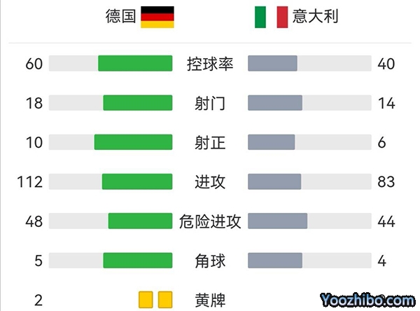 第10分钟,德国队耐心组织攻势, 维尔纳禁区内得球分给左路的劳姆,后者送出传中,点球点附近基米希跟进左脚推射得手,德国1-0意大利。